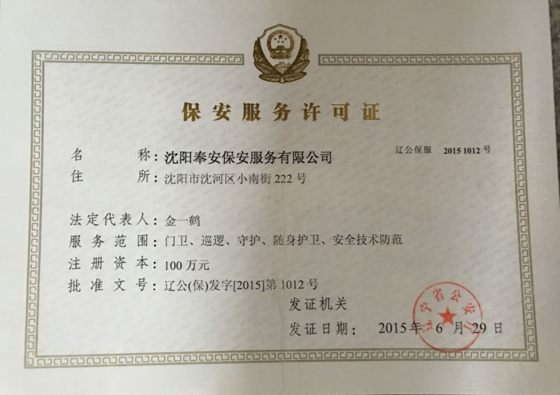 沈陽(yáng)奉安保安服務(wù)有限公司(原沈陽(yáng)市沈河區(qū)保安服務(wù)公司)創(chuàng)建于一九八八年八月,是遼寧省公安廳、沈陽(yáng)市公安局批準(zhǔn),工商行政部門登記注冊(cè),全市首家具備保安資質(zhì)的特殊性服務(wù)企業(yè),隸屬于沈陽(yáng)市沈河區(qū)政府直管的全民國(guó)有企業(yè),現(xiàn)為中國(guó)保安協(xié)會(huì)會(huì)員單位和省保協(xié)、市保協(xié)常務(wù)理事單位:在全市同行業(yè)中率先通過(guò)ISO國(guó)際質(zhì)量認(rèn)證,是市工商局批準(zhǔn)的“重合同守信用”免檢單位和沈陽(yáng)市政府采購(gòu)中心保安服務(wù)項(xiàng)目重點(diǎn)競(jìng)標(biāo)單位;擁有一支專業(yè)化、標(biāo)準(zhǔn)化、職業(yè)化的高素質(zhì)保安隊(duì)伍,是公安機(jī)關(guān)重要的輔警力量。